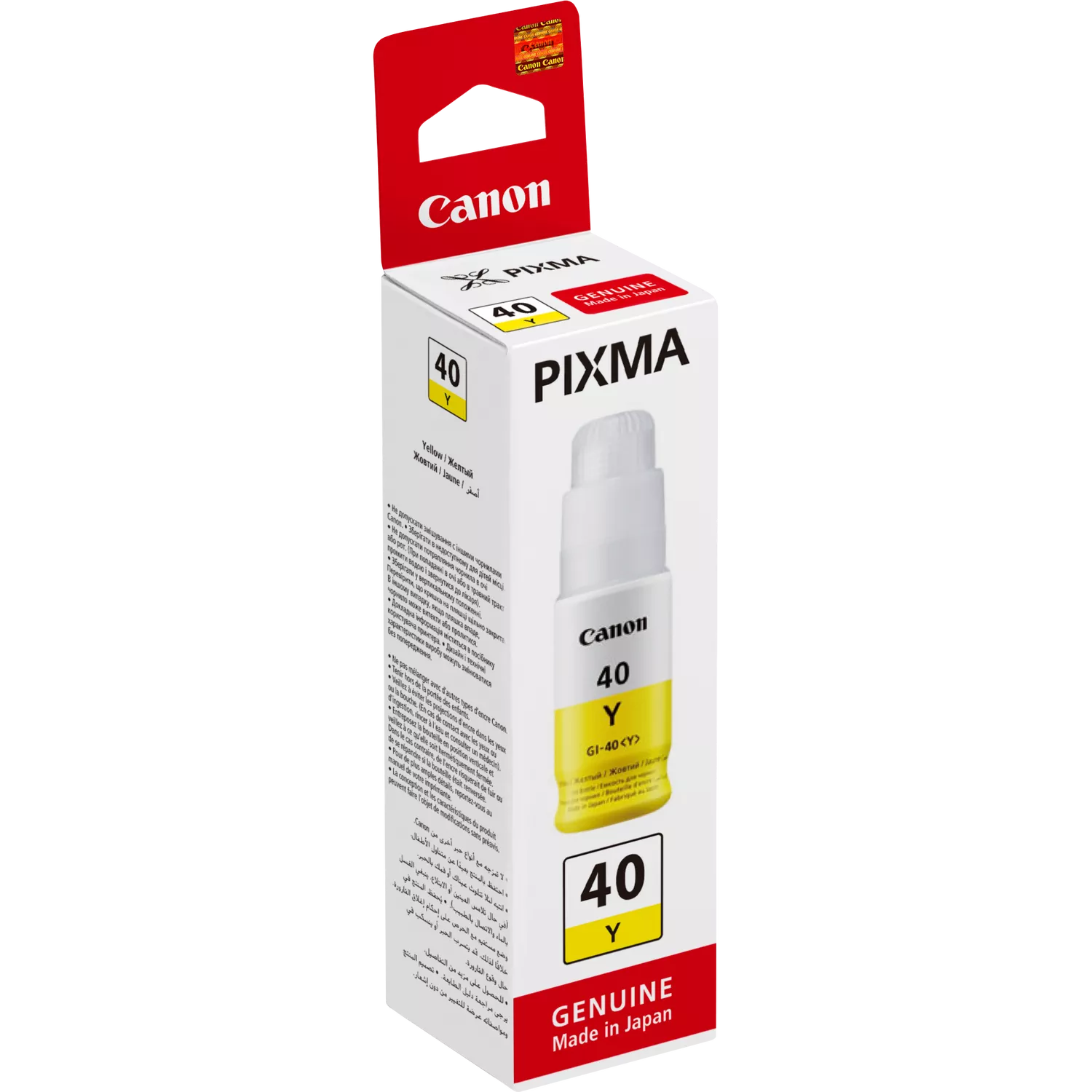 The Canon GI-40 Yellow ink bottle is designed for high-volume printing, offering exceptional yield and efficiency. With a print capacity of up to 7,700 pages per full set of colored inks, it is compatible with select Canon PIXMA models and ensures vibrant, borderless printing. Its no-squeeze, mess-free design helps prevent spillage, and it complies with EU safety regulations (GPSR).