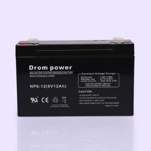 The DROM Power Lead Acid Battery 6V 12Ah is a high-capacity, rechargeable power source designed for backup power, UPS systems, and other energy storage applications. Delivering 6 volts and 12 amp-hours, it provides stable and reliable energy for emergency lighting, security systems, telecom equipment, and small renewable energy setups. Its sealed, maintenance-free construction ensures leak-proof operation, safety, and minimal upkeep. Built for durability and long service life, this battery is suitable for residential and professional applications requiring dependable low-voltage backup power.